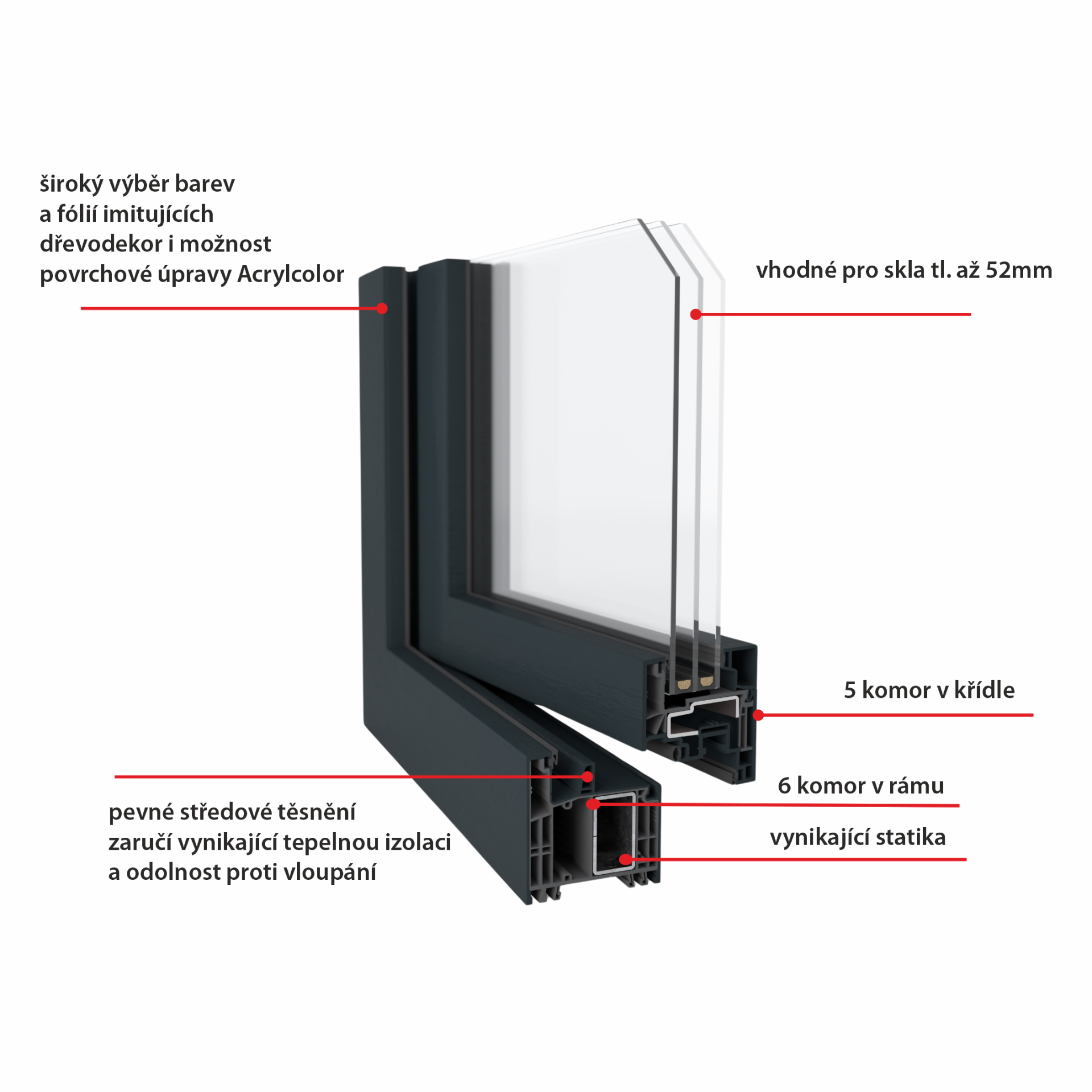 - 6komorový systém s rovným nebo předsazeným křídlem